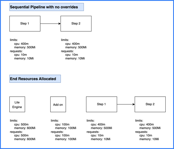 - The total stage (Lite Engine) resources for pipelines with sequential steps are calculated as