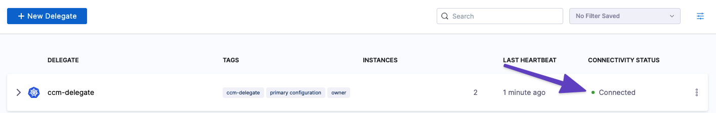 In the Harness UI, verify that the delegate appears in the delegates list. It might take two or three minutes for the delegates list to update. Make sure the Connectivity Status is Connected. If the Connectivity Status is Not Connected, make sure the Docker host can connect to