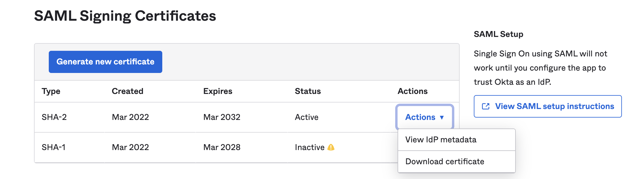 2. Select Actions to download the SAML metadata file.