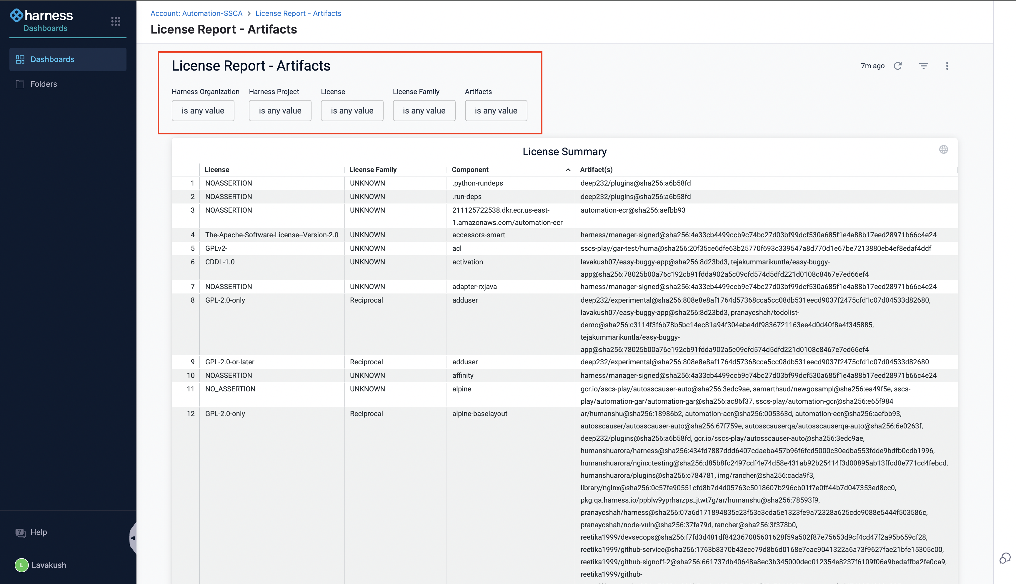 With Harness License Reports Dashboards, you can easily access detailed information about the licenses and license families associated with your artifacts or code repositories and all the relevant data in one place, which eliminates the need to manually check each component’s license individually across all the projects.
